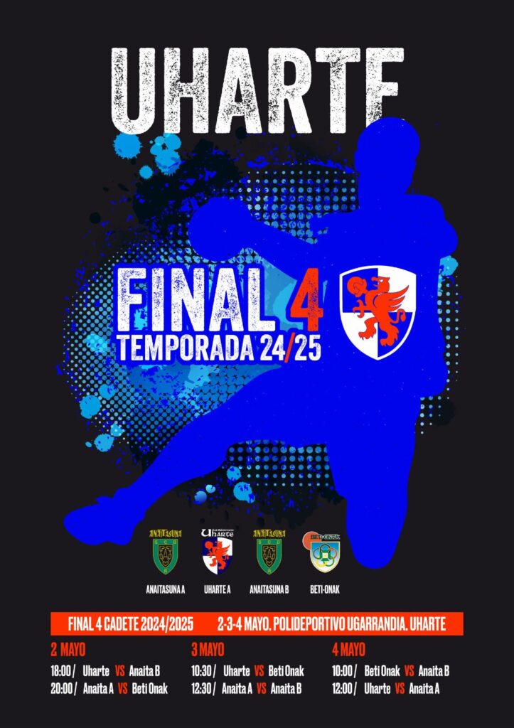 El próximo 2, 3 y 4 de Mayo de 2025 se celebrará en el pabellón de Ugarrandía de Uharte la FINAL a 4 de la categoría Cadete Masculino, en la cual participará nuestro equipo Cadete ( Club Balonmano Uharte) que tras la competición regular ha quedado en segundo lugar.